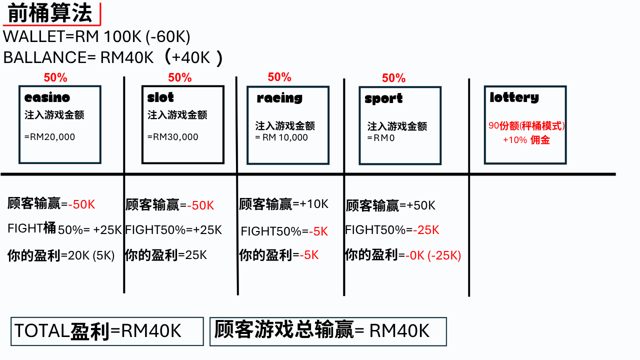This example demonstrates how profits are allocated in the Front Bucket model across different game types like casino, slot, racing, sport, and lottery, with a 50% Fight allocation applied to each.