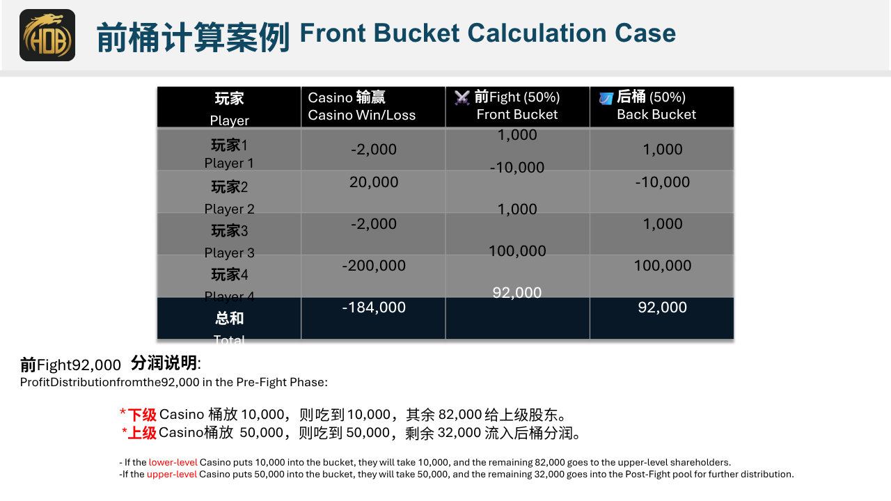 If an upper-level Casino contributes MYR 50,000, they take that amount, and the remaining MYR 32,000 flows into the Post-Bucket pool for further sharing.